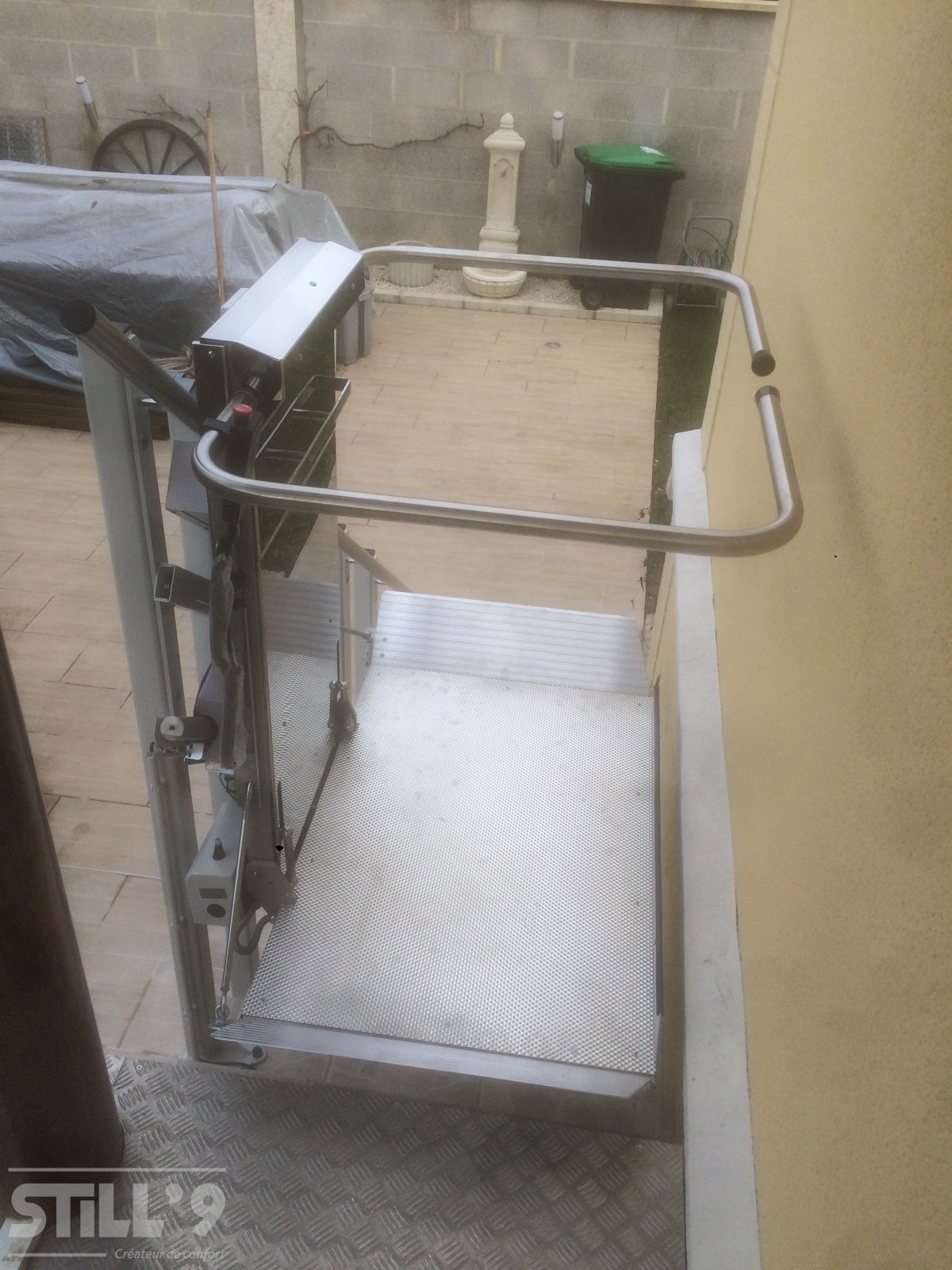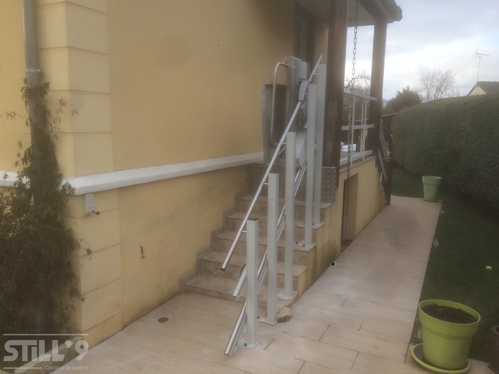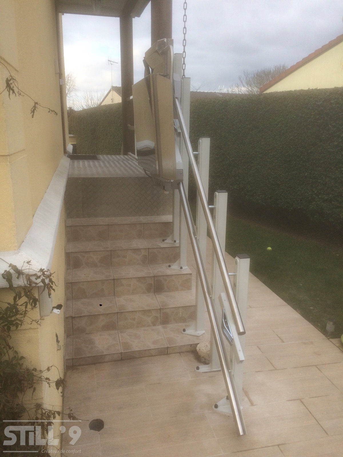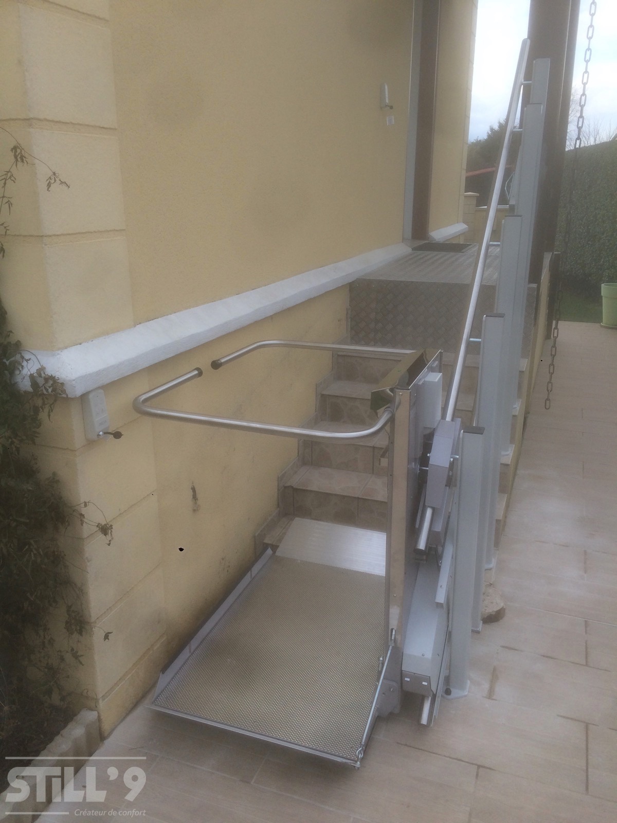 La société STILL'9 a procédé à l'installation d'une superbe plateforme oblique au Plessis-Pâté 91. Cette habitation comporte un petit escalier pour accéder à l'entrée. Notre client se déplaçant en fauteuil roulant nous a contacté afin de trouver une solution. Il fallait aménager cet escalier, nous lui avons donc proposé d'installer une plateforme oblique extérieure.